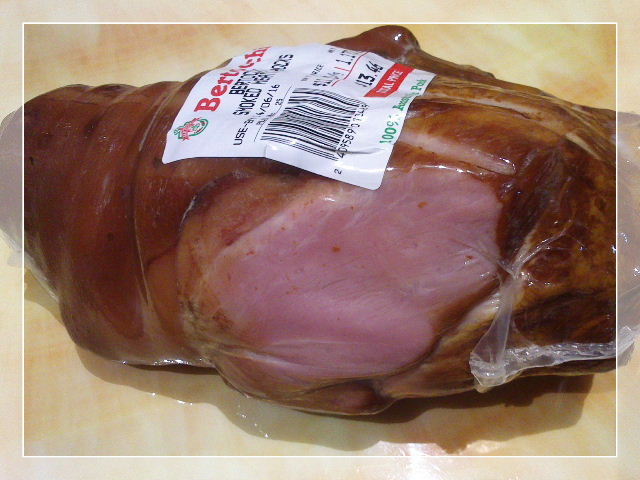 这个烤蹄胖英文叫“Smoked Meaty Hock”,仔细观察精肉非常多,货架上还挂一个大标签,原价从$11.5降了$3,才$8.5/公斤。保鲜日期要到来年的6月,肯定不是质量不好削价处理,于是就挑了一只。