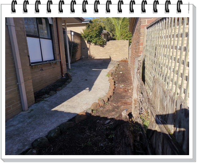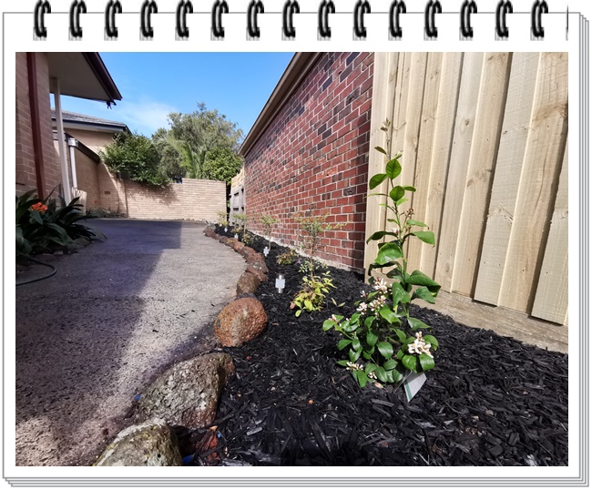 我要做一个花园的装修,这张照片右侧一长条泥土裸露的地方,我想在表皮铺上一层Mulch起美观作用,我现在有两种颜色的Mulch,一种是红色的,一种是黑色的。请问按照墨尔本目前的流行色,按照这个位置墙壁和地面的搭配,请问我应该选择红色的还是黑色的?