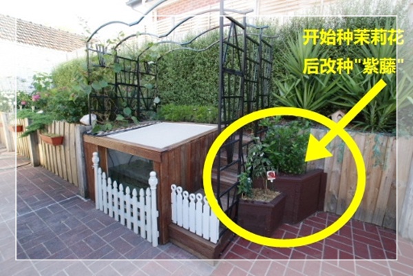 10多年前利用台阶制作室外鱼池,紫藤就种在箭头所指处