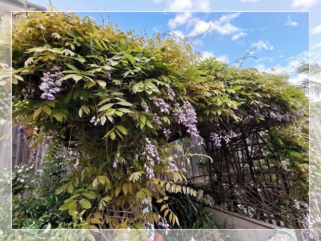 紫藤很容易种植,花朵也很美丽,缺点就是花期很短,前后不到一个月,短则一两星期(看当时的天气)。每年我家紫藤刚刚开始有点新芽和花苞,我就施一点促进开花的液态肥料,所以每年开花季节都是轰轰烈烈。紫藤几乎不要打理,在冬天完全落叶后,稍微整理一下枯枝,枝子过密的地方,剪掉一些多余的枝子,这和别的爬藤植物的修剪都是一样的方法。