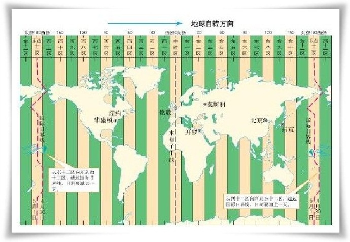 这里就有一个问题:我们在地球上的位置不同,每个地区看到的黎明、正午、黄昏和子夜都不一样,地球上新的一天究竟应该从谁那里开始,到哪里结束呢?各地都有自己的时间,会造成很多混乱。于是在1884年国际上达成协议,在人烟最稀少的地方,设定一条线。这条线位于太平洋中的180度经线上,作为地球上“今天”和“昨天”的分界线,因此称为“国际日期变更线”。它北起北极,通过太平洋,直到南极。这样假设这条线的地方为零点,为日期的分界时间。所以凡越过这条变更线时,日期就要发生变化:从东向西越过这条界线时,日期要加一天;从西向东越过这条界线时,日期要减去一天。大家发现上面这条变更线不是一条完全的直线,而是在有些地方呈折线,这是为避免在同一个国家中同时存在着两种日期,最典型的就是基里巴斯群岛的这一段。