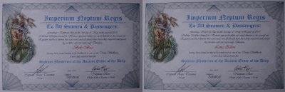 船上还准备有一条冰冻的海鱼,大家要和鱼亲吻之后跳进水池,在水池里“海皇帝”为各位祝福,扑通扑通大家争先恐后往里跳。而船上的铜管乐队演奏的却是电影“星球大战”的主题曲,不伦不类乐坏了所有人。最好玩的是我们有位餐桌的美国朋友,看起来很高雅的,什么唱歌跳舞、魔术表演之类的节目她根本看不上眼,一本书一杯红酒,很有情调。仪式结束后我在公众视频回放看到她也往水里跳。后来吃饭时,我就问她怎么回事?她说当时有点激动,脑袋里出现什么三姑六婶,她想跳到水里就可以和她们拥抱了。这一跳,连手机都泡在水里,还好没事。我们同桌的几位听了个个哈哈大笑,什么乱七八糟的!看来读书太专注,脑子会有些奇奇怪怪的念头。不过她的那份“穿越赤道”的证书迟迟没有拿到,这个她有点急,和我提过很多次,我说下船还是没有,我把我的证书名字擦掉,送给你吧。