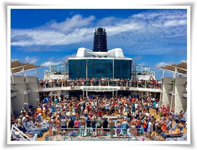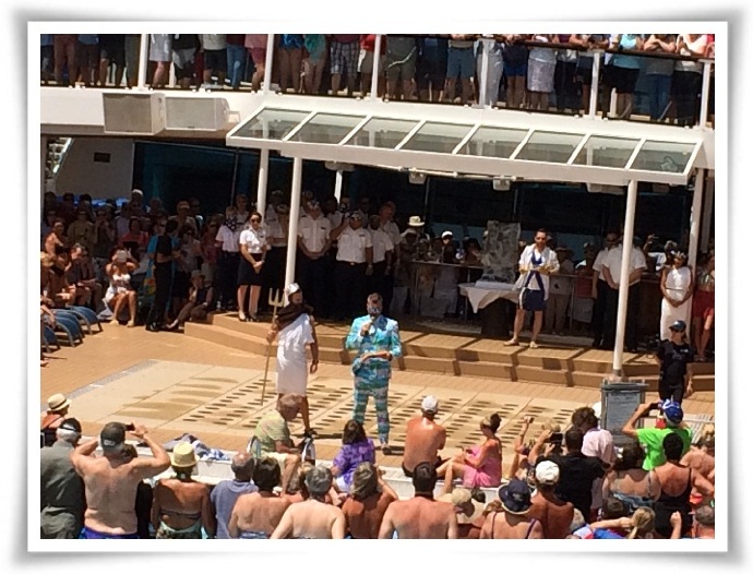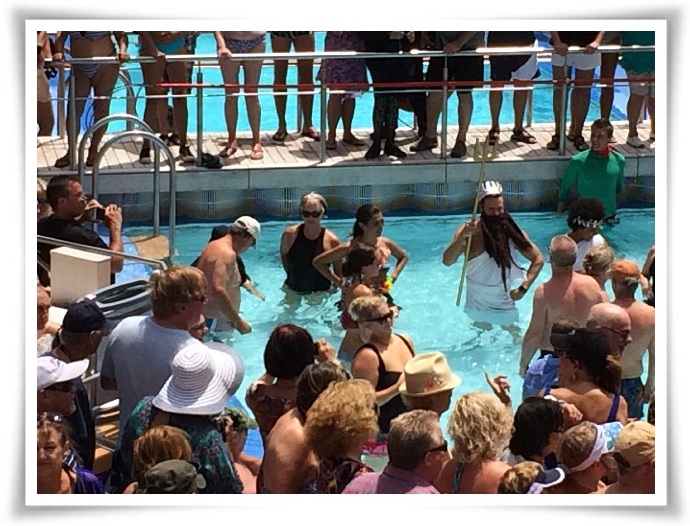 为了庆祝我们过赤道,船上还在当天举行隆重仪式,当然不会放在凌晨三点,而是放在中午11点。那天中午阳光明媚,气候温暖,仪式放在游轮顶层正中的水上设施和舞台边,观看的人真是人山人海。