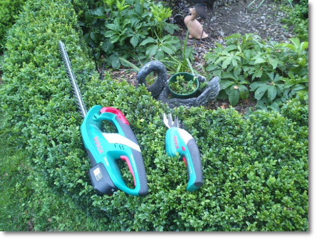 德国Bosch牌子锂电池的绿篱剪刀,右边的小规模修剪用的电动剪刀