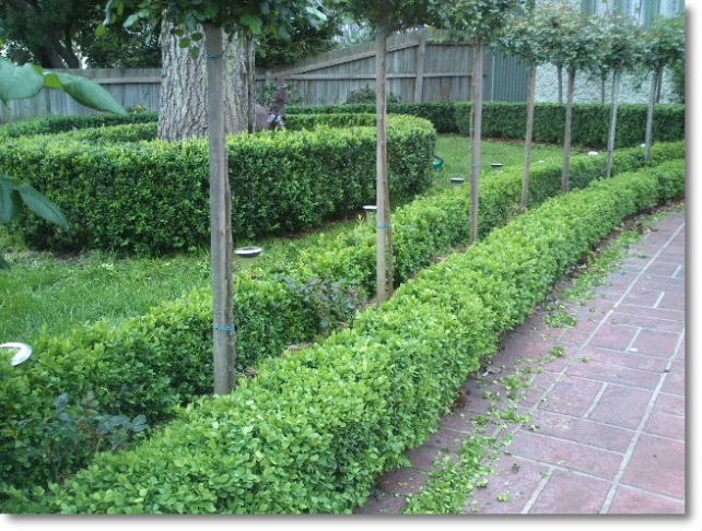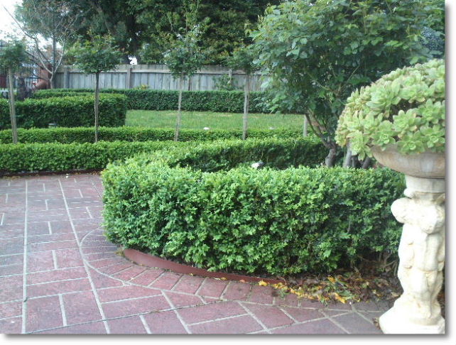 要是感兴趣但没有把握的朋友,可以去园艺店问一下园艺师,他们会帮助挑选一种本地符合你要求的树种。在澳洲用来做小灌篱,用得最多的叫English Box,可能开始是英国人培育的树种,很小很密的树叶,生长缓慢,常青,很容易造型,也很贱容易养,基本上不要什么肥料和水。开始我就奇怪,为什么用Box这个词?Box是盒子的意思,大概这个灌木可以修剪成四四方方像盒子一样。还有什么Aussie Box(澳洲盒子), Japanese Box(日本盒子), Chinese Box(中国盒子)等,五花八门的树种。各种“盒子”应该都有些区别,不过我建议用一种最普遍的就可以了。