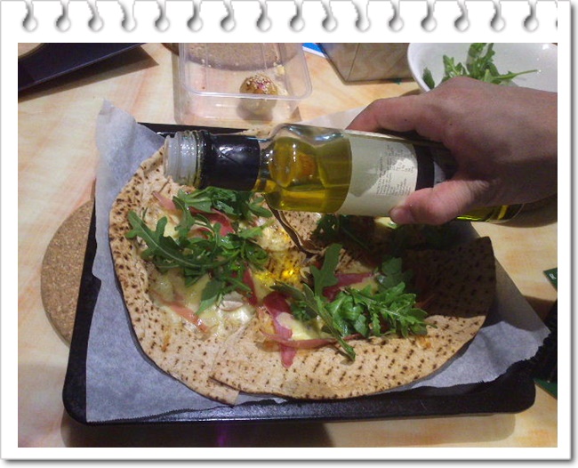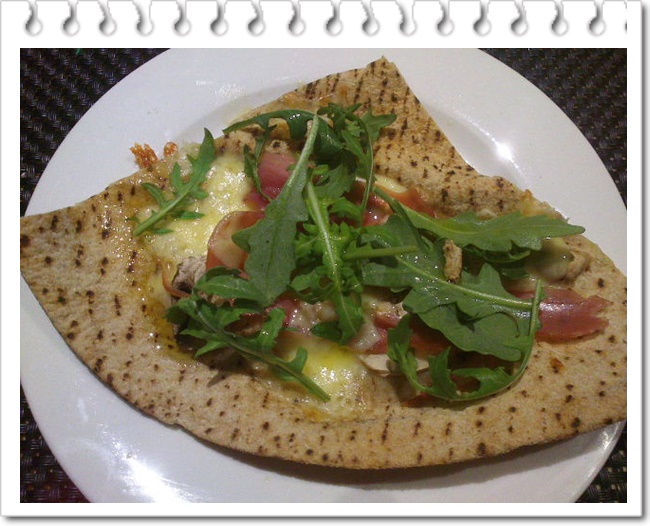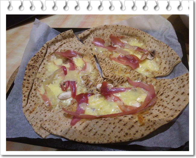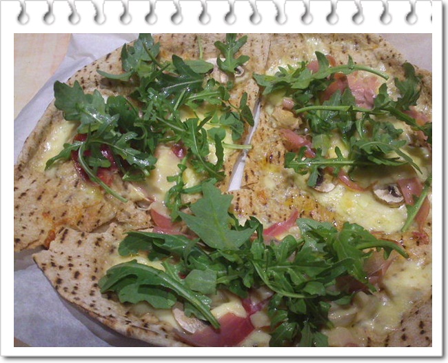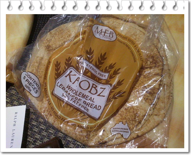 还要加一点奶酪,这个要专门用Parmesan奶酪,有点臭,味道很重,刨成薄片的那种。最后选用一种黎巴嫩薄饼作为底子,制作很简便也很快,10分钟就做好了。有荤有素,比较健康,卡路里也不高,很好吃。
