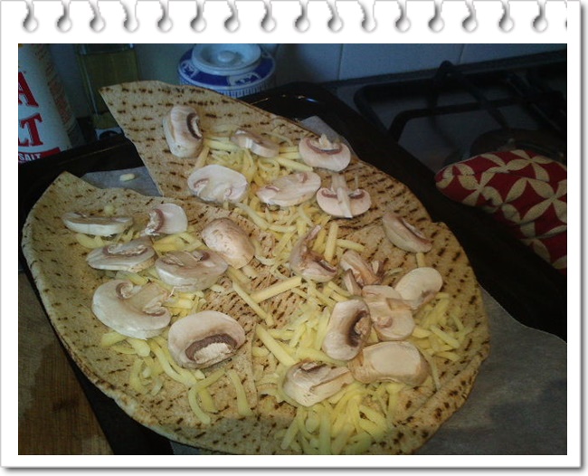 在薄饼上放上一般的奶酪和蘑菇片,小烤箱预热200度烤5分钟。