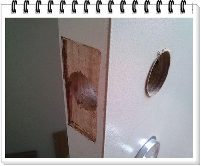 按照尺寸,打上两个洞,一个安装锁舌,一个安装锁芯,配件盒里都有尺寸和图纸