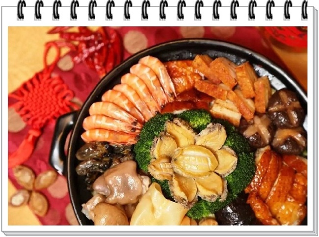 回家后我搜寻了一些资料,原来“大盘菜”是一些地区华人逢年过节,餐桌上经常出现的佳肴。一些华人家庭,“大盆菜”更是过年必吃的一道年菜。这个“大盘菜”相传源自香港和广东的民间特色美食,属于粤菜菜系,已经至少超过700年的历史。“大盆菜”像一个聚宝盆,外表形象象征团圆(一位宁波朋友告知,又名“大团圆”),而内在层层叠叠的食材则寓意丰盛。大盆菜因为美味简便而越来越受人们欢迎,不变的则是团圆丰盛的传统寓意。