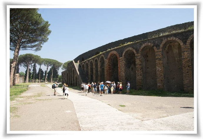 庞贝古城已被联合国教科文组织定为世界文化和自然遗产,目前只开放三分之一,其余部分还埋在地下或是没有发掘完整。我们看到很多从世界各地来的游客,一些意大利学校,甚至美国学校的学生把历史课搬到这里来上。入门口服务台有包括中文的手册可以免费领取,还可以租借一个语音播放器,实地会有很多解说,慢慢行走参观可以花一天的时间。手册上甚至可以查到当初谁是这个屋子的主人,姓名年龄和职业,家有几口人都有,不过我想一般的游客只是大略看看,没有必要了解那么详细。