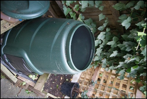 我家购置这种德国产的250立升桶形堆肥容器,底部是敞开的,上部有密封的盖子,也就是有机垃圾的入口。在侧面的底部正前方有个堆肥出口处,有机垃圾经过几个月的发酵和腐烂,打开这个小门,就可以挖取优质有机肥料。这种设计是最合理的,在收集堆肥时最省力。