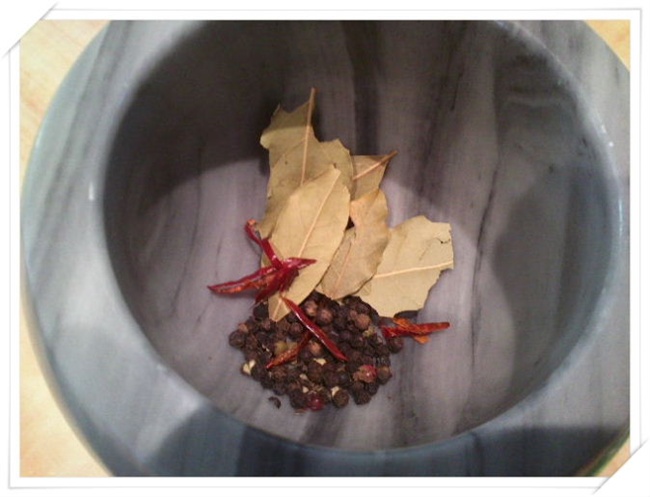 用盐,花椒,香叶(我用一种西人的Bay Leaves),辣椒干等一起放在研钵里捣碎。各人的喜好不同,香料可以有些不一样,最好把香料放在炒锅,或者烤箱上烤一下,香料会更香。