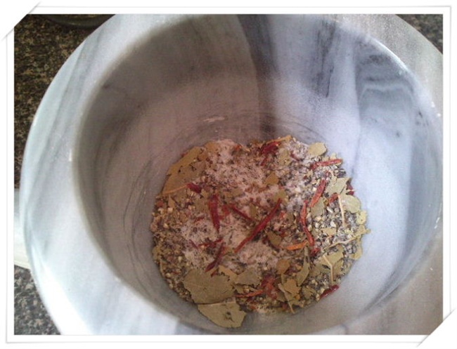 第一步:将香料和盐放在石臼里充分捣碎混合
