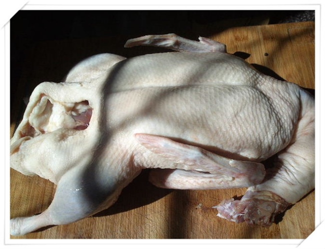 将鸭解冻,洗净沥干,去掉翅尖,鸭屁股,鸭脖子上的淋巴,肥油等等。