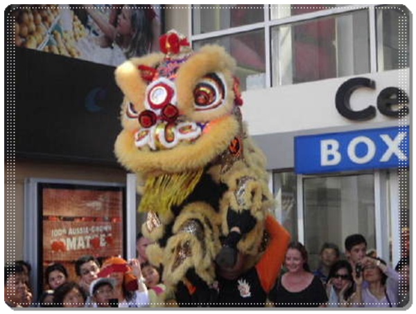 这里介绍一下华人商家庆新年的一个习俗。从大年初一开始,墨尔本的很多醒狮团,同乡会,帮会的祈福团队就开始在各个商铺门前舞狮欢庆中国新年。一个团队少至二三十人,多至上百。身着民族帮会服装,有两只以上的欢蹦乱跳的漂亮“狮子”,几个“大头娃娃”,敲锣打鼓地挨家挨户(商家)舞狮,祈祷来年万事顺利,恭喜发财。
