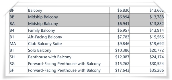 下面这个价格是本文截稿3天后,我在同一邮轮销售网站的截屏。这个价格单说明:尽管还有部分票子,但不会太多。我将我升级的类别Highlight,可见现在又跌了7百块,还要便宜。
