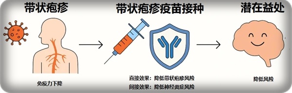 - 抑制潜伏病毒的再激活:水痘-带状疱疹病毒(varicella-zoster virus)在神经系统潜伏多年后可能反复激活,引发炎症和神经损伤。疫苗可防止这种再激活,从而可能减少炎症相关的痴呆风险