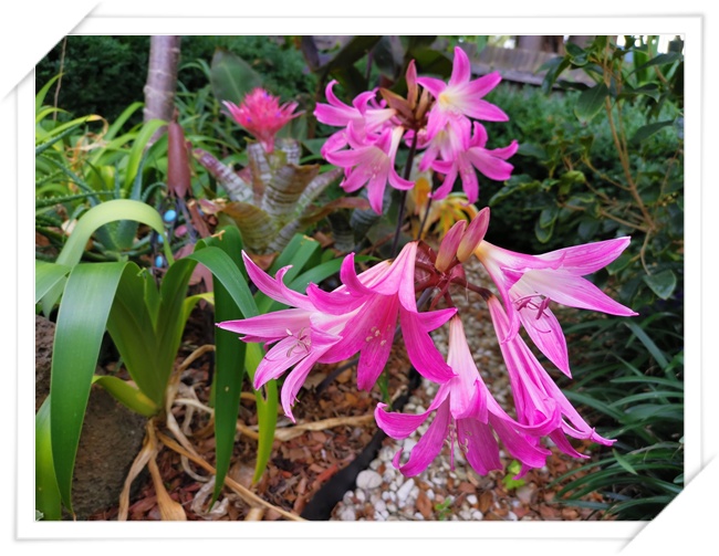 上次介绍过《鹿葱》Lycoris squamigera,开美丽的花朵。今年想不到不远处有棵凤梨科植物“蜻蜓菠萝”Aechmea Bromeliaceae,同时也开花,两组花卉争相斗艳,花期都非常长。
