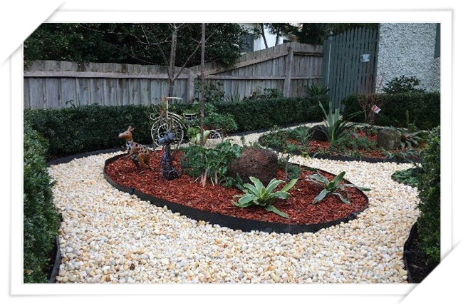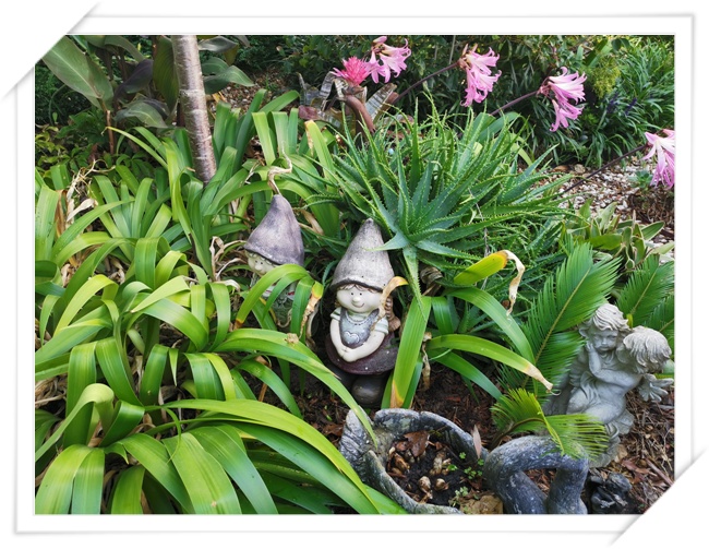 我有一块草坪,因为懒得定期割草,15年前我将这块地方画几个圈圈,做成小岛型的“种植区域”,这个小岛种植一棵垂挂的“樱花”,“非洲鸢尾花”,“美人蕉”,“铁树”,“龙爪芦荟”,“风铃花”,“边界麦冬”,“蜻蜓菠萝”和“鹿葱”。除了铁树没开花,这些植物每年都开花,只是不同的季节。(请见《花园改造:在草坪上“画圈圈”》一文)