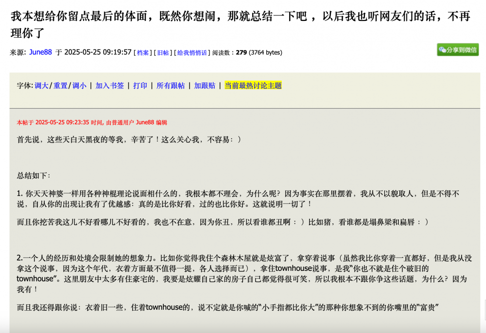 下面就是她扯我家人的截图,一页截图不下来, 我分成2页截了,她自己说出的东西赖别人,然后自己污言秽语扯别人的爸妈弟弟儿子,我娃还那么小呢, 她也真下得去手,最毒妇人心呀,文学城要讲理是不是该封禁June88? 她主动挑事我举报了没用, 删完贴大家照常, 等我忍无可忍回应便删我一人的ID,这哪里还有天理可言?
