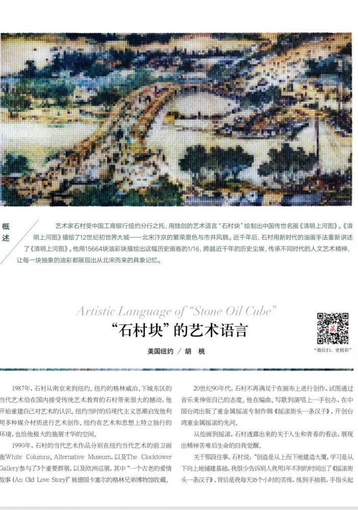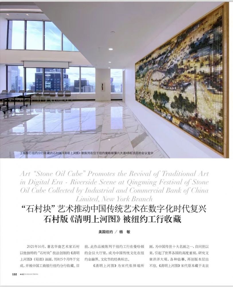 艺术家石村受中国工商银行纽约分行之托,用独创的艺术语言「石村块」绘制出中国传世名画《清明上河图》。《清明上河图》描绘了十二世纪初世界大城,北宋汴京的繁荣景色与市井风貌。900多年后,石村用新时代的油画手法重新讲述了《清明上河图》。他用1万5千6百64块油彩块描绘出这幅历史画卷的1/16,跨越近千年的历史尘埃,传承不同的时代赋予人文、艺术的精神,让每一块抽象的油彩都展现出从北宋而来的具象记忆。