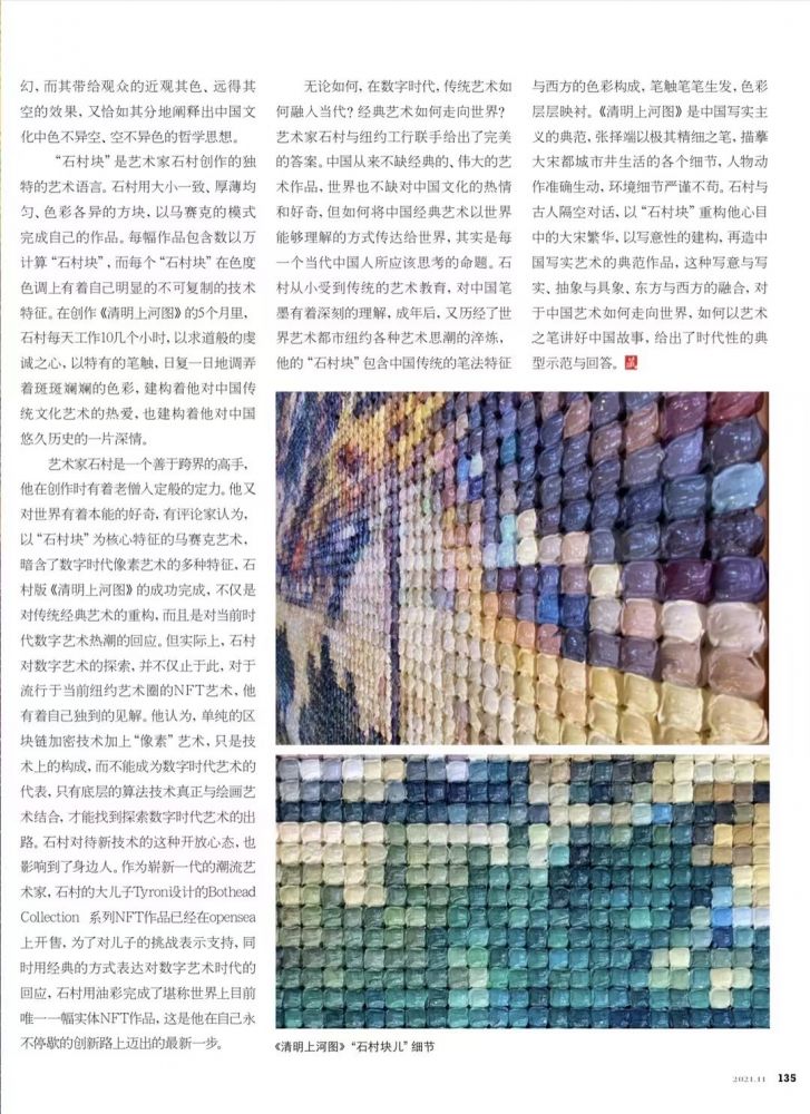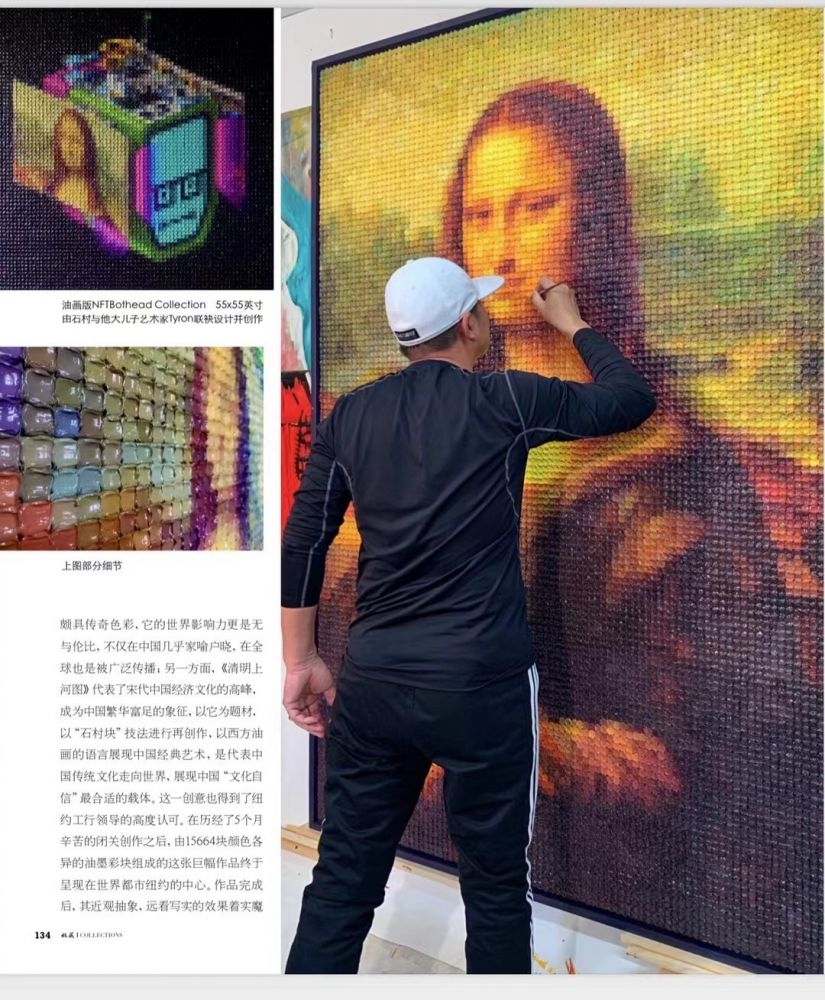 《清明上河图》在石村看来,是中国传统艺术的巅峰之作,它所代表的不仅仅是北宋繁华鼎盛的象征,更是那个时代赋予艺术的一个精神符号,中华历史文化浩瀚星空中一颗璀璨的明星。《清明上河图》本身已经超越了物质世界的羁绊,超越了画家、时代、历史的范畴,成为了人类文明的结晶。在今天的纽约,石村块这一绘画本身是这个数码时代的结晶,用今天人们所熟知的语言讲述了跨越时代的古老故事。因此,用像素般的石村块画出的《清明上河图》油画与一千年以前绢本绘制的《清明上河图》都完美跨越了时空,在精神的维度上交相辉映各自的光芒,因此而独一无二。