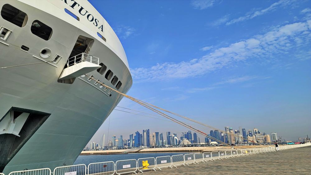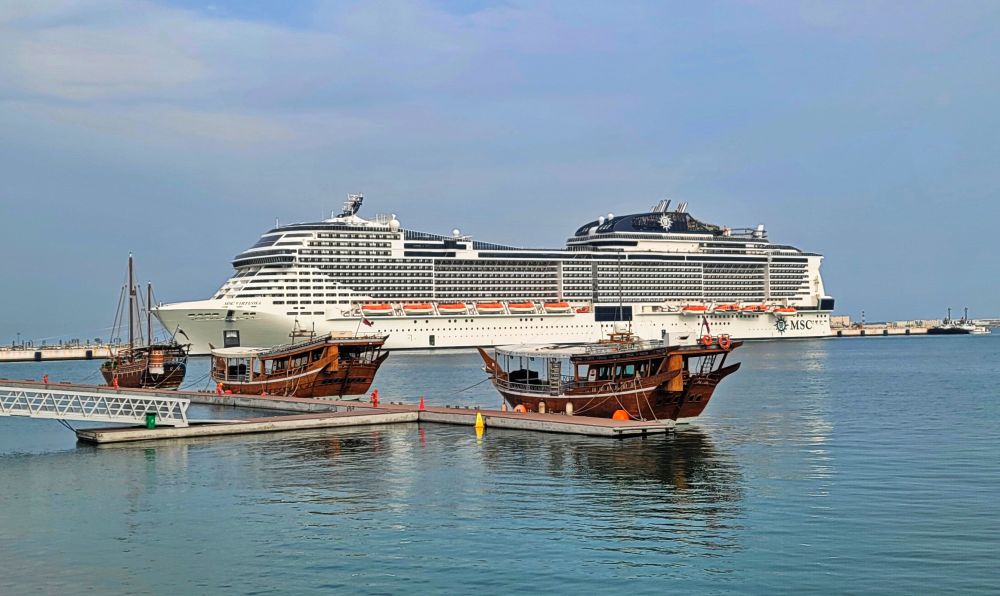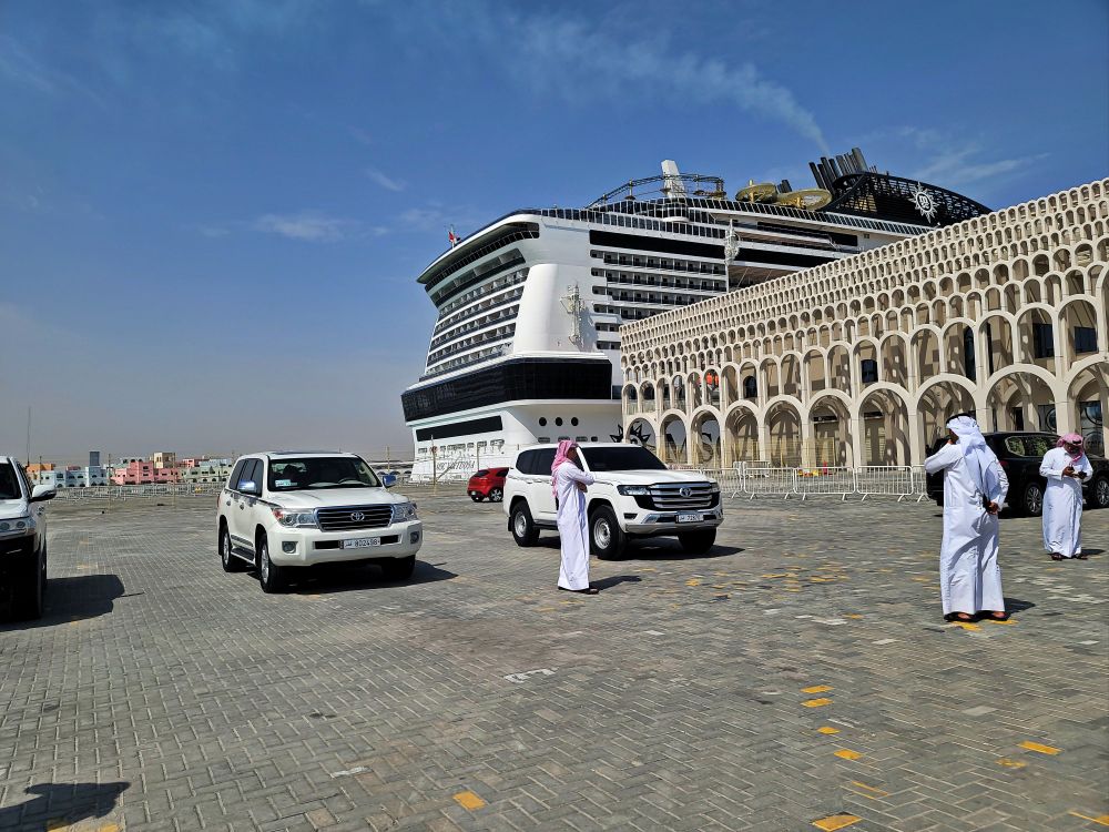 多哈的游轮港口风景融合了现代与传统的元素,港口周围是碧蓝的大海,清澈的海水与蓝天相连,尤其在日出或日落时,金色的光芒洒在水面上,显得格外迷人。现代化的游轮停靠在港口,气势恢宏,而港口背后是多哈的天际线,高楼林立,如标志性的火炬大厦、卡塔尔国家博物馆等建筑形成了一个充满未来感的都市景观。港口远处,蔚蓝的波斯湾水面上可以看到小型木制传统船只(称为“dhows”),与现代游轮形成鲜明对比,象征着多哈的历史与现代的融合。