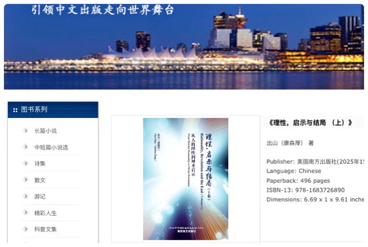 加拿大政论家、作家、诗人万沐兄在万维网自己的博客里(https://blog.creaders.net/u/2919/202501/506445.html)发表了他为《理性,启示与结局》(上卷)撰写的序评。出山非常感谢万兄为该书作序写评,荣幸之至。万兄学识渊博,令人敬佩,对该书的评价入木三分,相信对广大读者了解此书大有裨益。祝愿本书与万兄的序评能够使得广大读者从中得到来自上帝的祝福和[