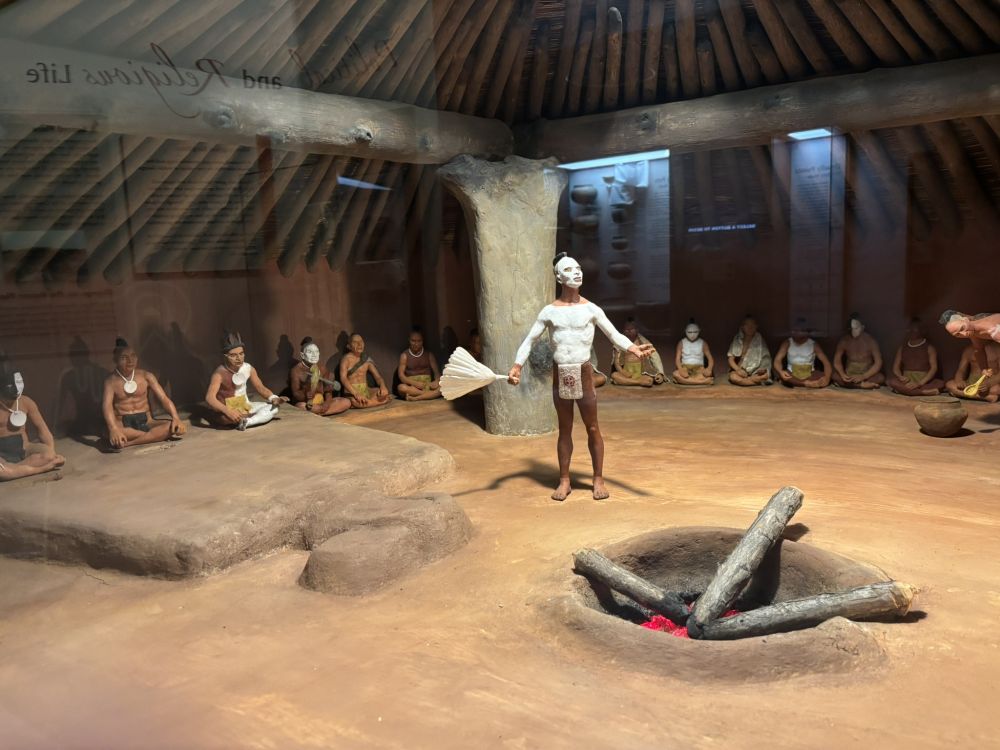 Ocmulgee Mound土墩遗址实际上是一座原住民城镇。几座土墩是重要地标,其中最大、最高的是神庙土墩。 如果投胎首领家族,那就可以住在最高的神庙土墩上, 同时这里也是举行各种仪式的场所。其他较小的土墩,如储粮土墩、葬礼土墩等,用于不同的用途。首领是氏族中最高的地位,几乎相当于统治整个城镇的"国王"。氏族成员的居所围绕着大土墩分布,附近还有用于运动的空地,也是后来与欧洲殖民者进行贸易的地点。