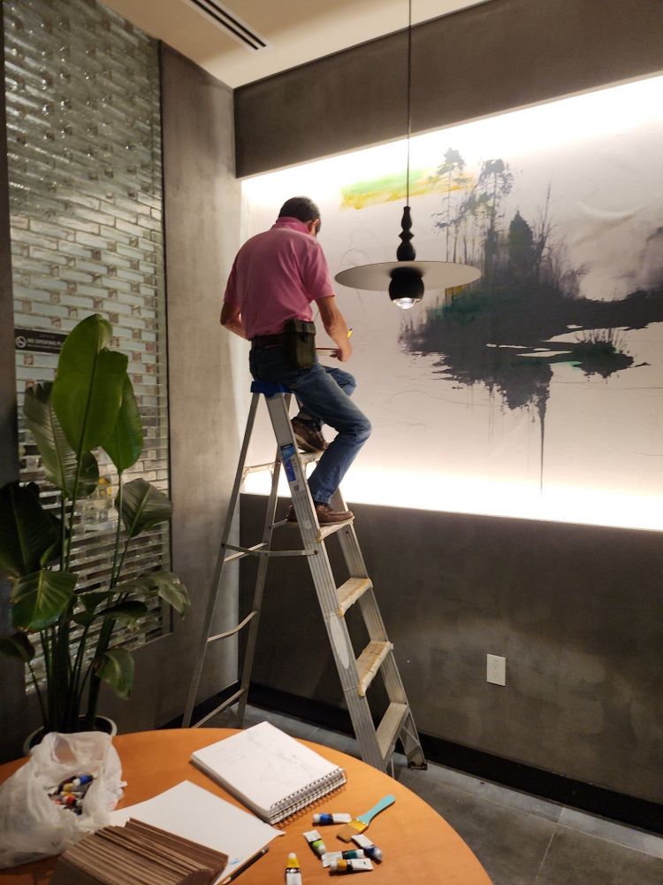 基于这个点,我跟Mary叽哩哇啦了一通:别管那些零碎的破事,这不,一个电话叫来几个老墨,谈好价格后,有人领着他们干就是了。疯子的长项和能耐不在菜肴面点上面的。我补充说,那些吃食由大厨监制,你应该“剃过头的给我上‘(电影《东进序曲》里的台词)。把那墙上我俩看不过去的鸟画破字给我换了。一夜过后,Mary发我一张照片,照片里疯子登上了梯子,开始按夜不睡里支出来的豪气劲头和草图,墙上绘画。