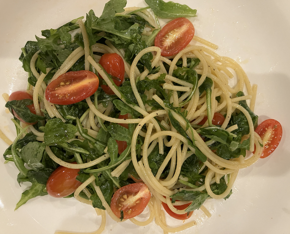 材料(二人份):1)半颗红菊苣(Radicchio),切成丝2)10个橄榄(Oliver),切成碎块3)5盎司(约142克)意大利通心面(Penne)4)橄榄油、盐、黑椒粉做法(约13分钟):煮一锅水。当水锅里的水沸腾后放点盐,放入意大利通心面煮13分钟(搅拌多次),关火,去水。将去水的意面放回热锅,然后放入红菊苣丝、橄榄碎块、橄榄油、少许盐(橄榄较咸,吃淡的话可不放盐)、黑[