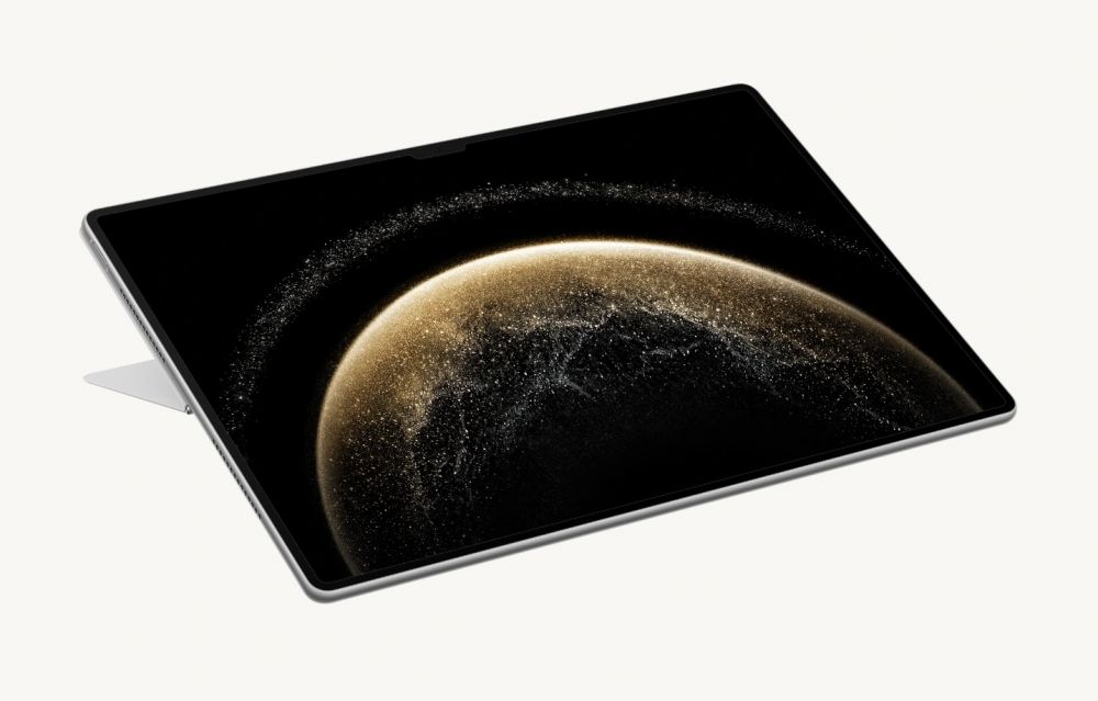 另一个值得关注的特点是其官方配件键盘是蓝牙键盘,有内置电池,靠平板的背板反向无线充电,而不像iPad靠物理接触的三个磁吸点给键盘供电: