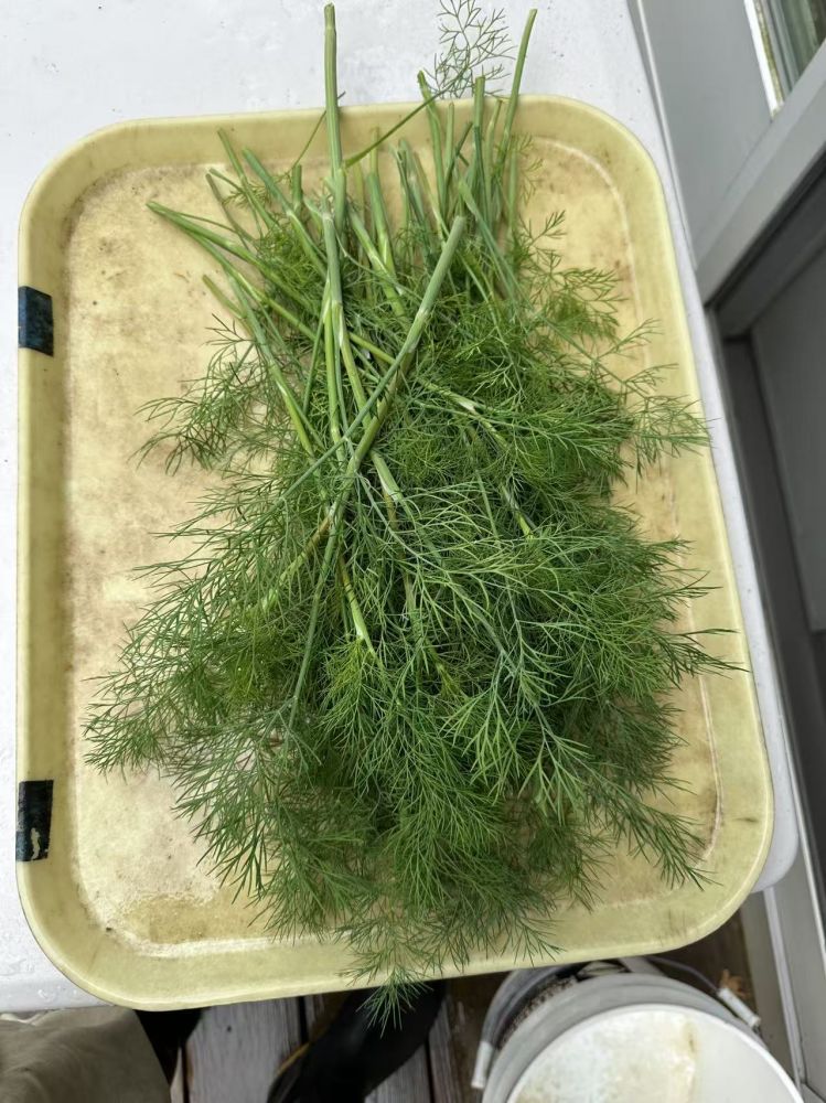 这茴香种子是四月间从朋友那里淘来的,回国前种在两个七加仑的花盆里。可惜今年北方天气偏冷,出苗速度明显拖了后腿。我是五月底从中国回来,刚一落地就迫不及待地采摘了一次,顺手包了顿茴香饺子,解馋开胃。