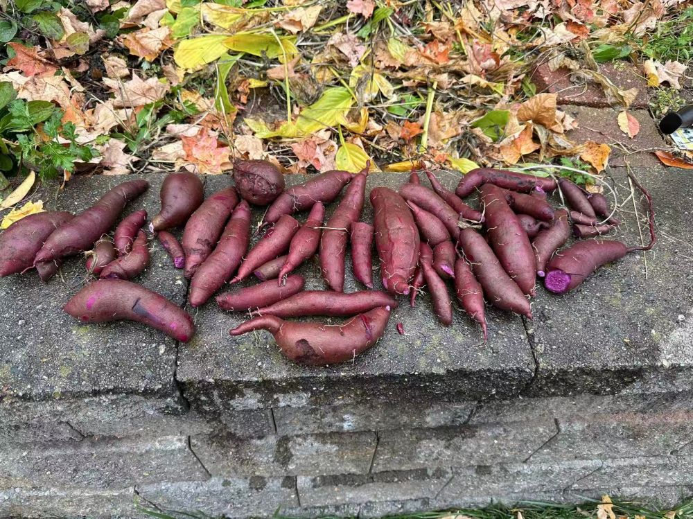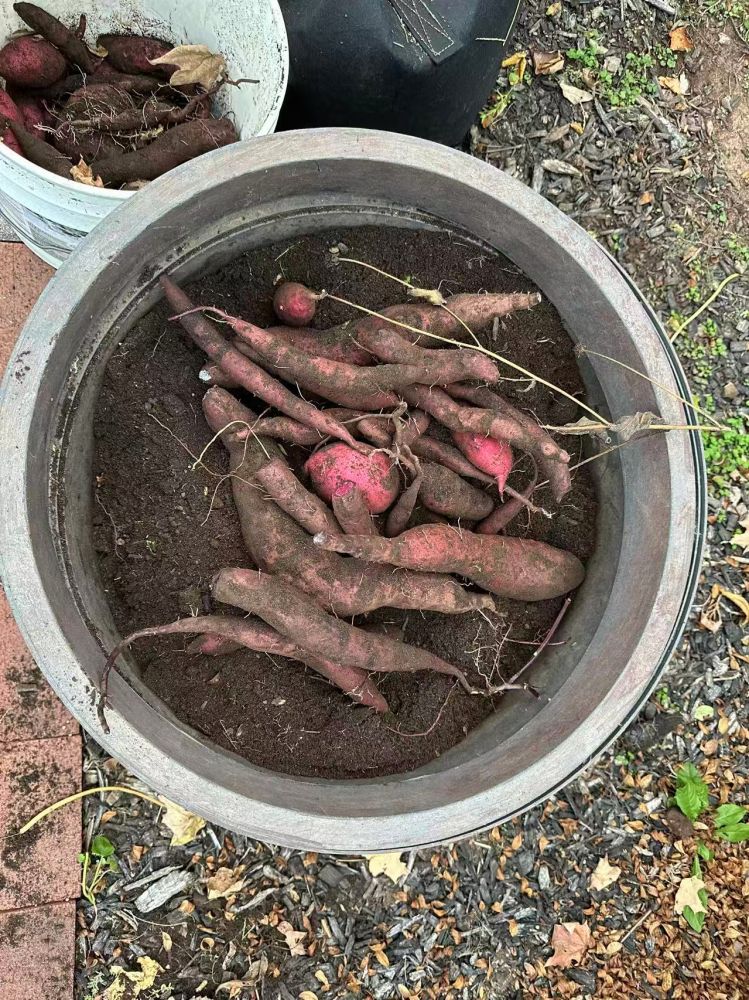 挖地瓜算是个体力活。按网上的教程,我先把藤剪掉,然后试图直接拽地瓜出来。结果发现藤一拽就掉,根本带不出地瓜。地瓜都深藏地下,一点也不靠近地表。我拿起铁锹往下一挖,没控制好力气,竟把几个地瓜直接劈成两半。只好换上小铲子,改成考古模式,像挖文物似的,小心翼翼地刮着土,慢慢往外掘。可耐心是有限的,尤其当铲子碰到硬块时,我的考古精神立刻破功,又弄伤了几只地瓜。最后我得出一个结论:收地瓜比种地瓜难多了。要说最省力的办法,应该是把整盆土倒出来再筛地瓜,但那盆子实在太大,一个人整不动。于是我就半挖半刨地折腾了两个小时。