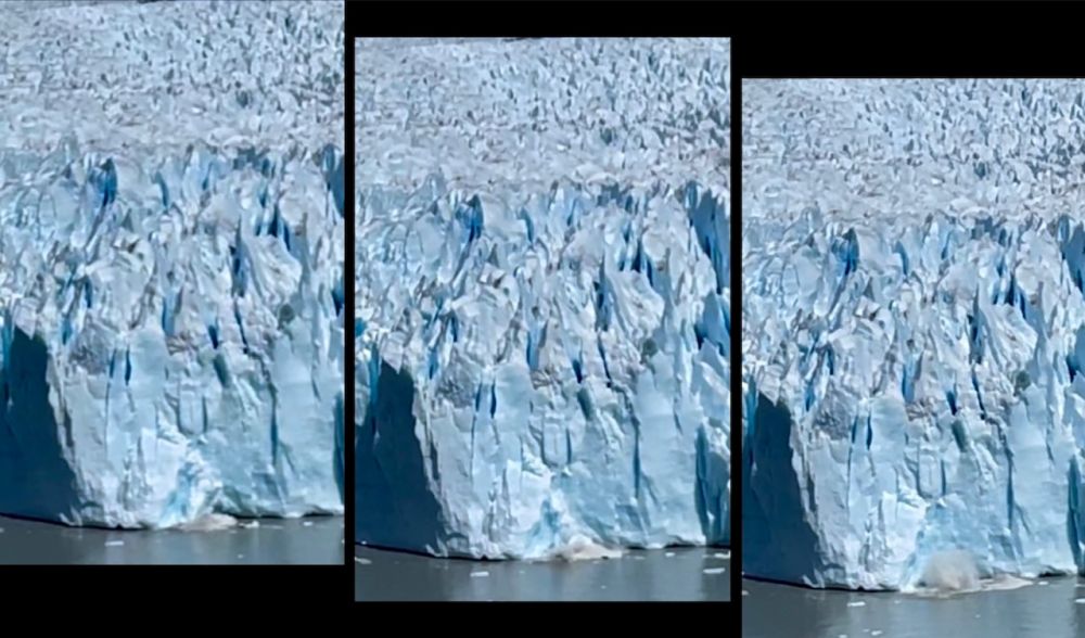 当冰块掉入水中的巨响传来,有点惊心动魄。我看到6次冰块坠落,大都小型。这是video掐出来的照片,效果欠佳。