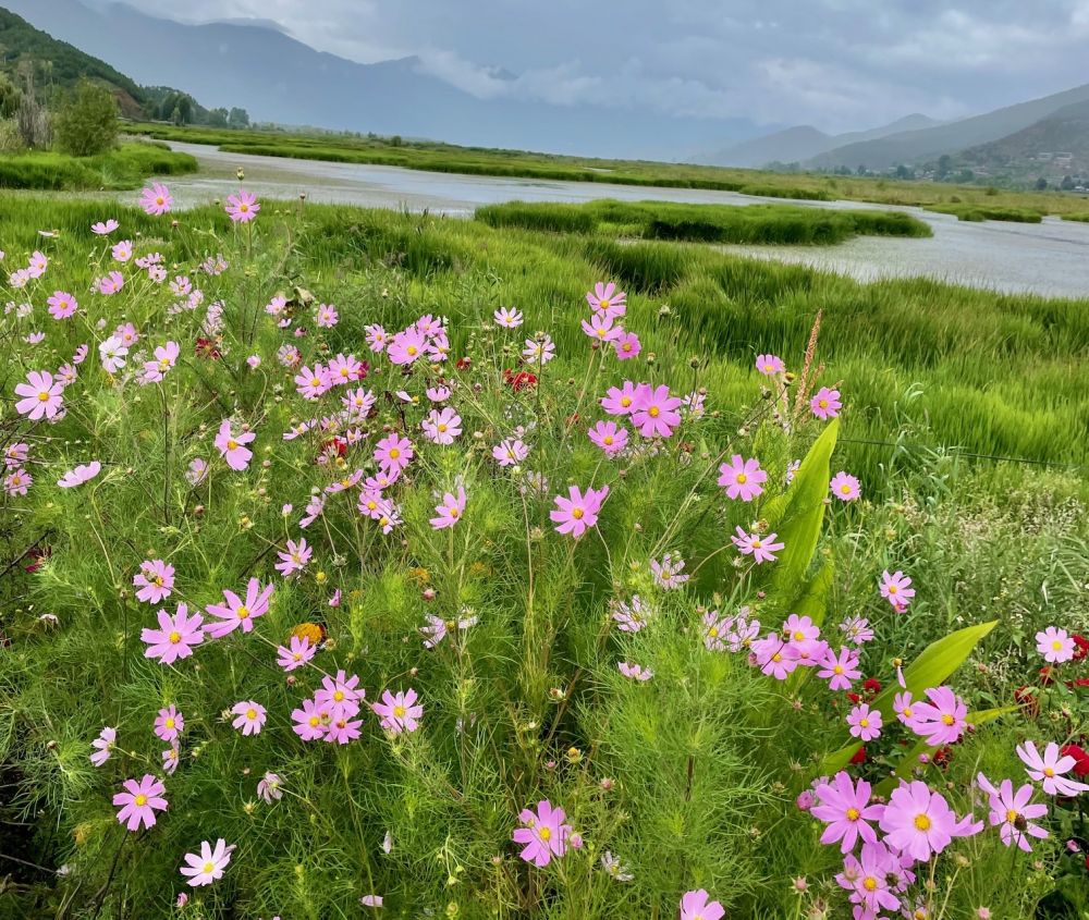 正是洛桑花季节,粉孜孜的细嫩花儿,煞是好看。