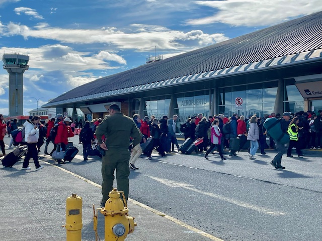 我们赶到机场,离我的行李箱被误下机场已经过去一个半小时。汽车堵了有半里路,宽大的停车场里站了至少1千人,大概是刚游完南极返程的游客。