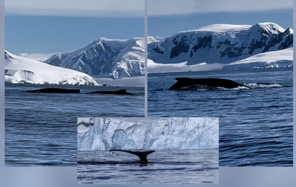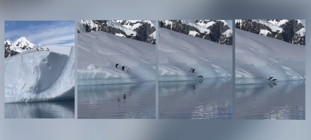 三只企鹅的故事:1.三只企鹅无所事事,在大冰山逛来逛去;2.一个不小心来到海边;3.领头企鹅没站稳,跌进海;4.后边两伙伴高呼:别怕,我们来救你!接踵2个扑通。后3照片是掐的视频,效果欠佳。