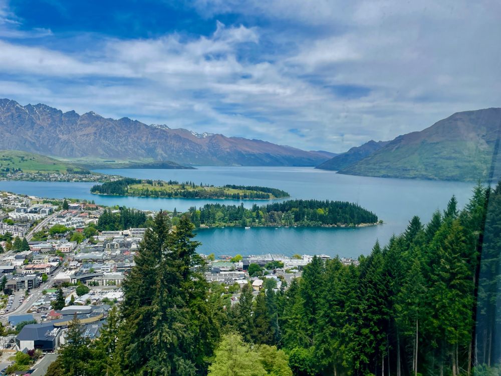 乘缆车上山顶,俯瞰皇后镇:数里皇后镇,湖清山色美。