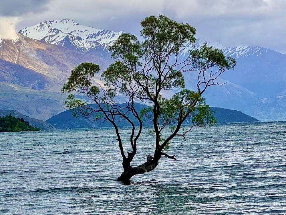 山峰错落、湖水涟漪、路途凹凸,可惜乌云密布。瓦纳卡湖Lake Wānaka,湖里那棵树大名:孤独的树,已经70岁。祝它万寿无疆!