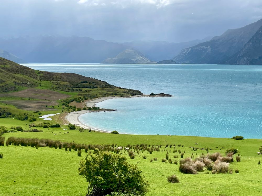 哈威亚湖Lake Hāwea,瓦纳卡湖的近邻。绿蓝的水、青葱的草甸、撒欢的牛羊…