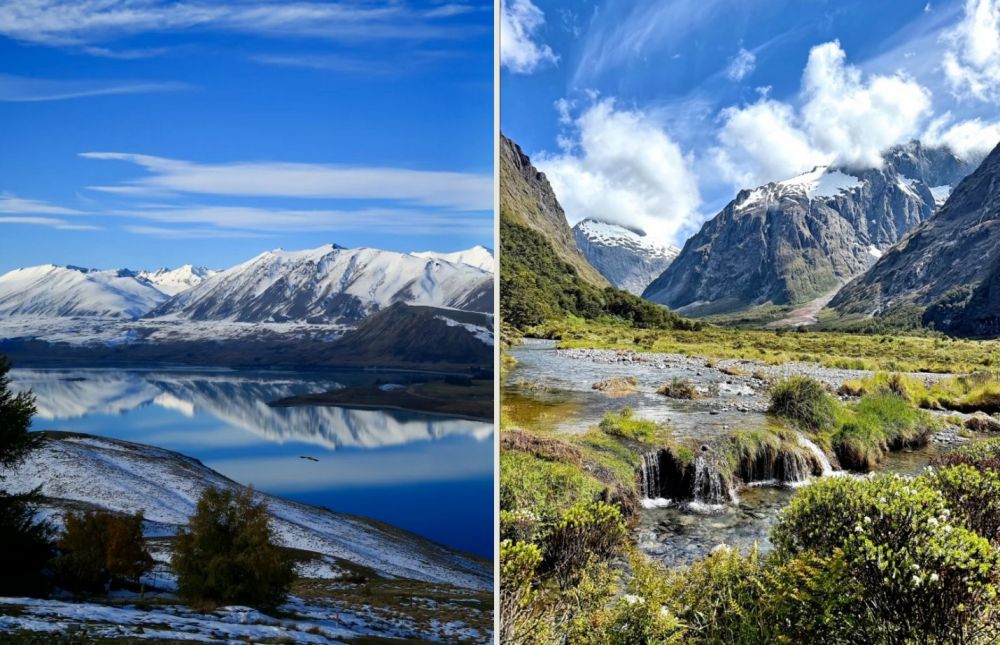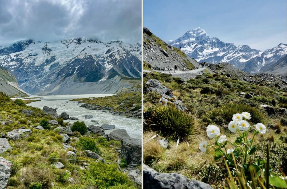 库克山国家公园Aoraki Mount Cook National Park。右图险峻雪山是南岛上的南阿尔皮斯山脉最高峰,3724米高。