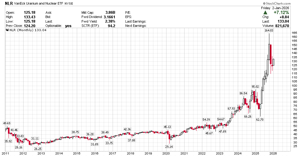 以铀为主题的ETF我找到了两个net asset比较大,流动性较好,且能代表这个行业全貌的:NLR和URA。这两只etf都是铀,但big picture却差别很大。下面是长期月线图