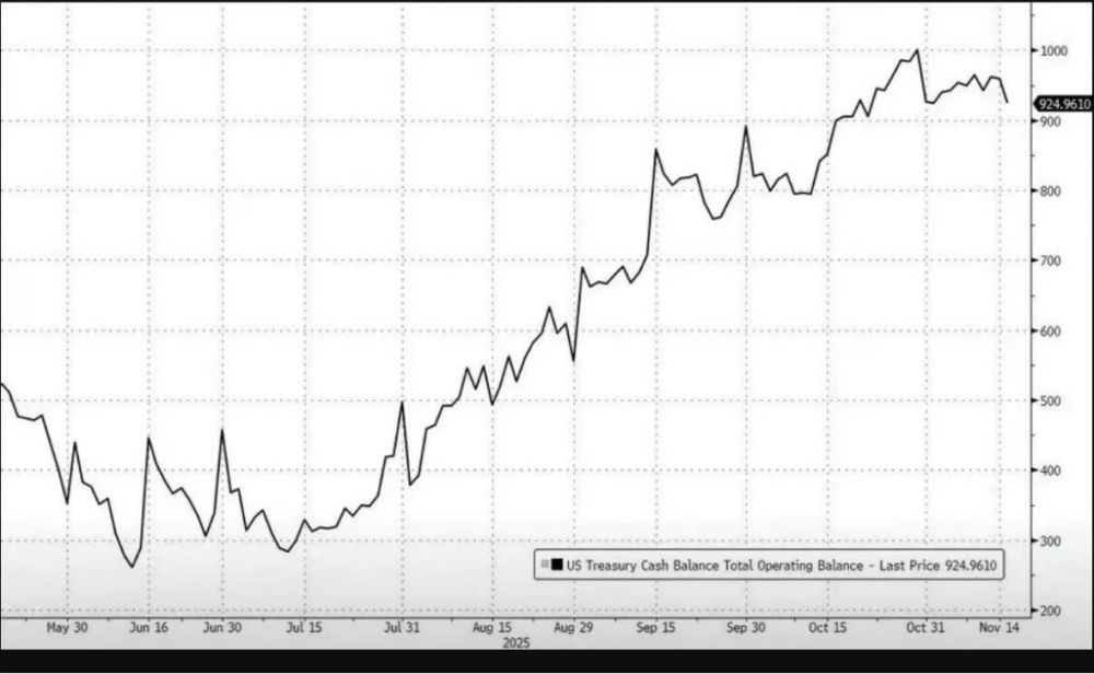 对科技股、比特币等风险资产,这或许是最重要的一张图 刚刚,最新数据显示美国财政部现金余额账户(TGA) 首次出现显著下行:财政部现金从 9590 亿美元减少 340 亿美元至 9250 亿美元。 摩根大通交易员认为回购市场压力是本月股市逆转的主要原因。由于美国政府关门、财政部一般账户(TGA)增加以及量化紧缩(QT)的综合作用,美国财政部此前大量吸收资本,导致金融系统内现金可及性恶化。 现在,美国财政部开始释放资金,市场流动性局面有望缓解。