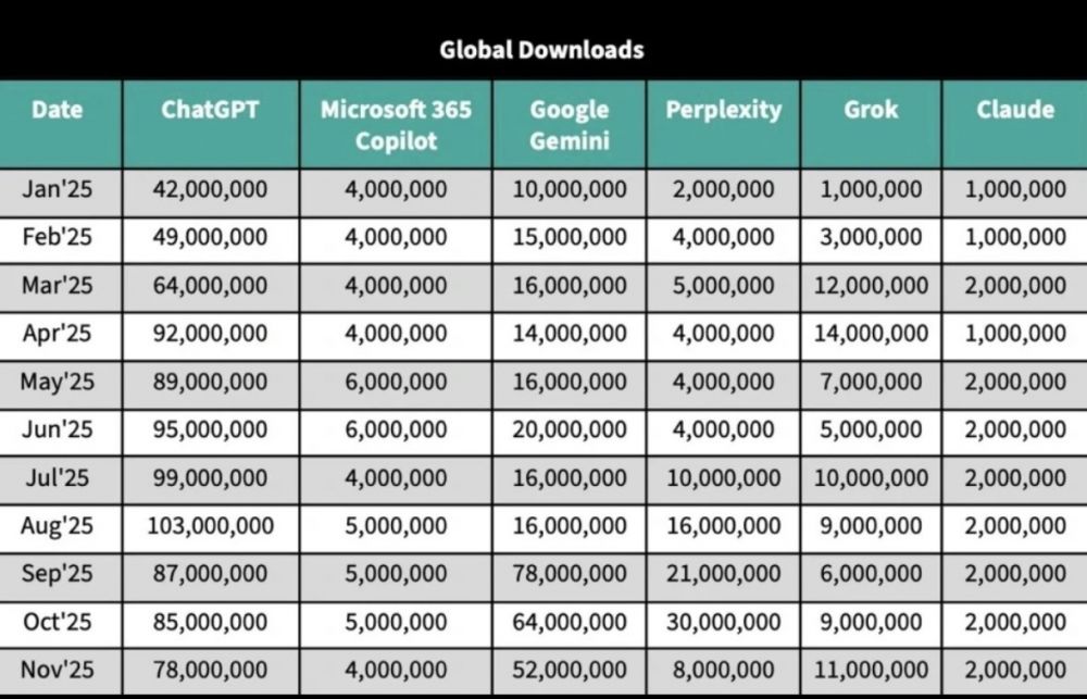 与此同时,谷歌Gemini正在上演了教科书式的后来者逆袭。同一时间段内,Gemini全球月活跃用户环比暴涨约30%,下载量同比增幅190%,日均使用时长同比增幅高达120%(从3月的约5分钟飙升至11月的11分钟),在新增、活跃、时长三大维度实现对ChatGPT的全面碾压。