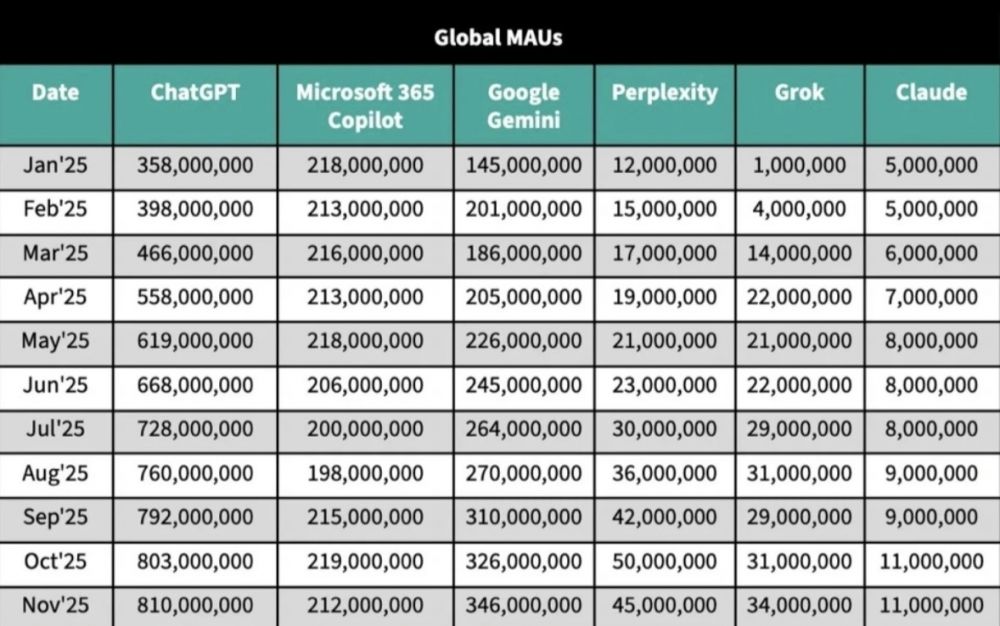 市场份额此消彼长更加刺眼。2025年5月至11月的七个月里,Gemini在全球主流AI聊天机器人(ChatGPT、Copilot、Claude、Perplexity、Grok等)总月活中的占比提升了3个百分点;而ChatGPT在最近四个月(8月-11月)份额反而下滑3个百分点。