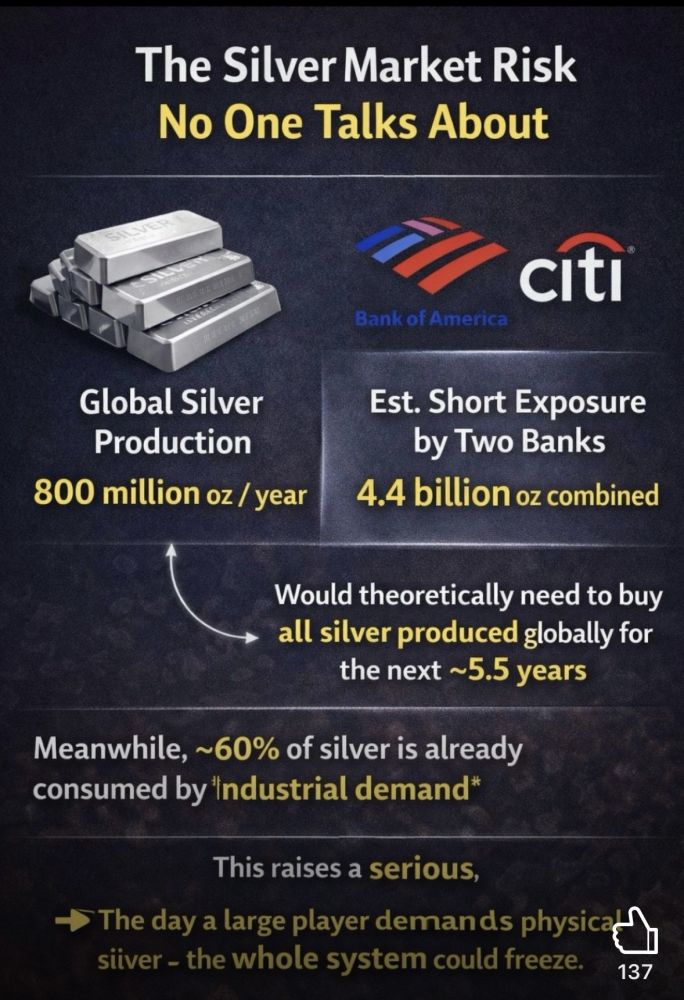 According to widely discussed market estimates and analyst commentary, just two banks Bank of America and Citi are believed to hold massive short exposure, estimated at ~4.4 billion ounces combined (BofA ~1B, Citi ~3.4B).