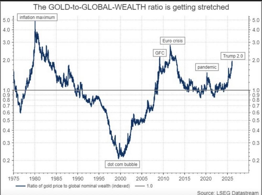 As the chart shows though, the gold-to-global-wealth ratio spikes when the risks we are insuring against become elevated (because the insurance premium rate to insure every dollar of wealth spikes).