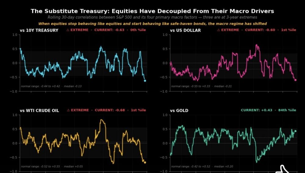 I pulled three years of daily returns and ran rolling 30-day correlations between the SP and its four primary macro factors — the 10-year yield, the dollar, oil, and gold. Three of those four correlations are currently sitting at the most extreme readings they've been at in the entire three-year sample. Not close to extreme. At extreme. 0th, 1st, and 1st percentile respectively. The fourth — gold — is in the 84th percentile. Normally uncorrelated assets are now moving in near-lockstep. Normally loosely-related assets are now mirror images of each other.
