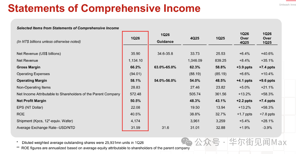 毛利率从58.8%(2025年一季度)大幅扩张至66.2%,累计改善7.4个百分点,背后驱动力是多重因素的叠加:先进制程良率持续改善、产能利用率满载摊薄固定成本、先进制程产品组合溢价效应,以及新台币兑美元汇率的阶段性有利变动(本季度平均汇率31.59,较去年同期32.88升值约3.9%)。